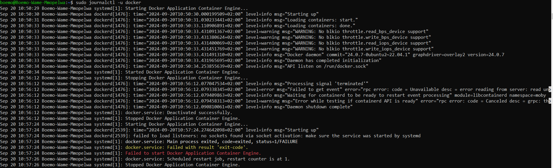 - Check logs for errors: Logs are essential when it comes to analyzing any software issue, logs provide details on when and why the Docker daemon has failed. It is recommended to run logs on a regular basis to check warnings before vulnerabilities occur. Use the following command to get Docker daemon logs.