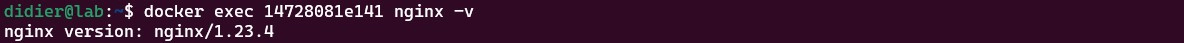 The preceding command uses docker exec to run the nginx -v command inside container 14728081e141. This command retrieves the Nginx version from the container and displays it in your terminal.