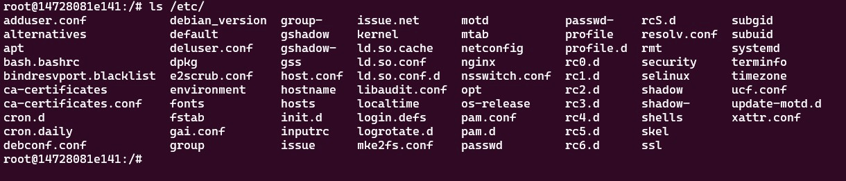 The preceding command opens a bash shell inside the container, allowing us to run commands and browse the container's file system. We can now execute various commands and interact with the container like in a regular shell.