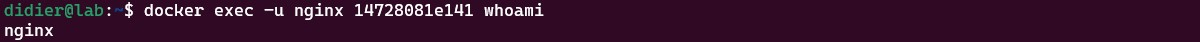 In the preceding command, we run whoami as the nginx user inside the container. The command will return nginx, indicating that it executed successfully with the specified user context.