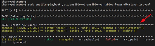 When executed, the playbook runs and creates the users with their corresponding attributes.
