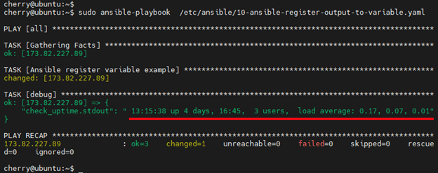 Let us check out how a register can be used to capture the output of a task. The playbook below runs the uptime bash command on a target host. The register module captures the output and the output is finally printed out to stdout.