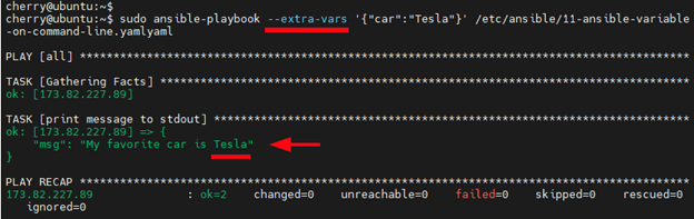 $ sudo ansible-playbook --extra-vars '{"car":"Tesla"}' /etc/ansible/11-ansible-variable-on-command-line.yaml
