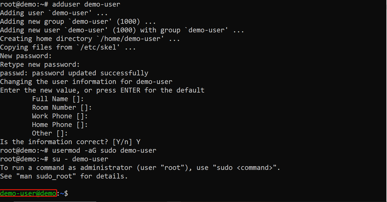 You should also create and switch to a non-root user to minimize the risk of accidental changes that could affect the entire system (demo-user is used here).