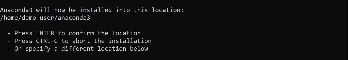 Next, you'll be asked to provide the installation location. Press Enter to accept the default location (which is your home directory) or indicate a different directory if preferred. After which the installation will start.