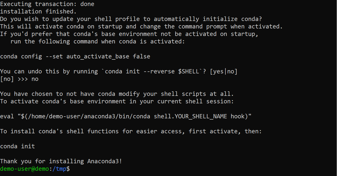 After the installation is complete, you will be prompted to initialize Anaconda. Type YES and press Enter to have Anaconda initialize automatically at startup or type NO if you prefer to activate it manually later.