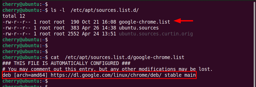 The installation of Chrome automatically adds a new file to the /etc/apt/sources.list.d directory labeled google-chrome.list. The file contains the repository entry for Google Chrome. To confirm this, run: