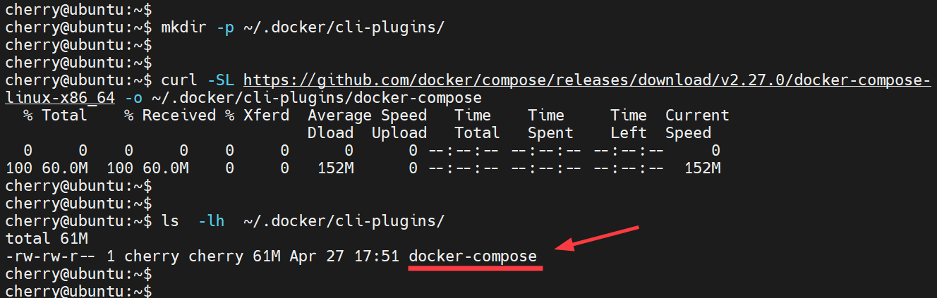 curl -SL https://github.com/docker/compose/releases/download/v2.2.27/docker-compose-linux-x86_64 -o ~/.docker/cli-plugins/docker-compose