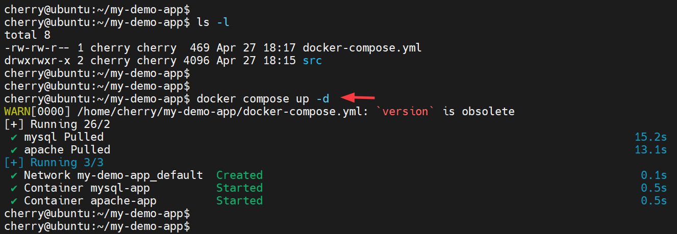 The command downloads the specified Docker images, in this case php:apache and mysql:8.0. Afterward, it creates the mysql-app and apache-app containers and runs them in detached mode using the -d flag. Additionally, it creates a default network for communication between the services, the mysql-data persistent directory for the database, and the src web directory for storing website files.