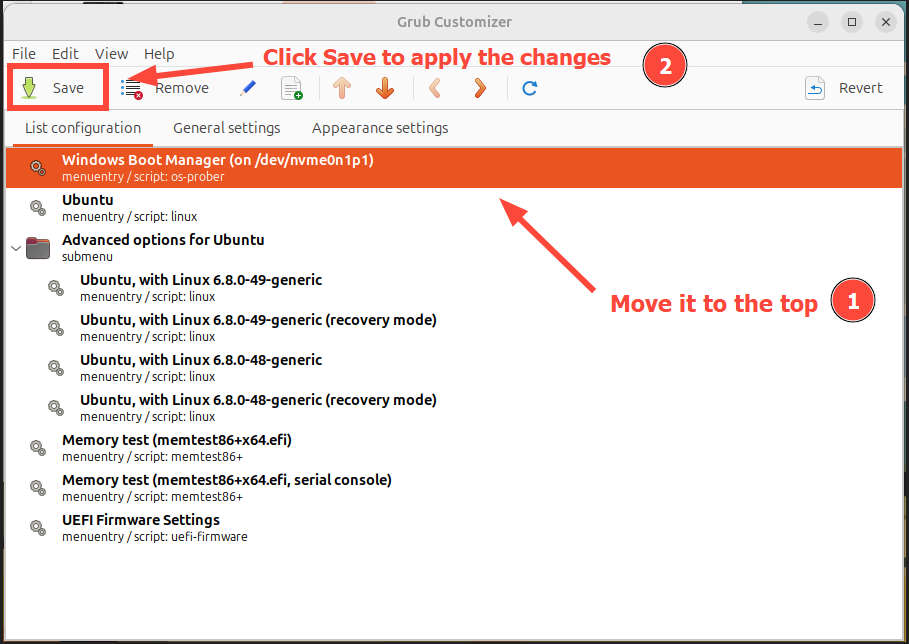 #Step 4: Modify boot order in Grub Customizer