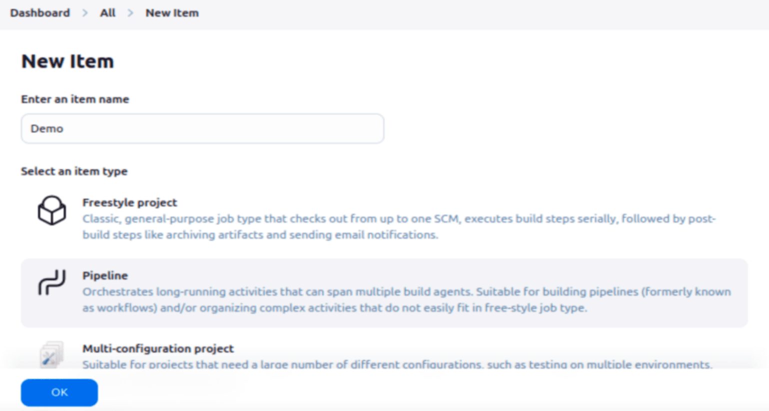 Name your job (e.g., "Demo"), select Pipeline as the project type, and click OK.