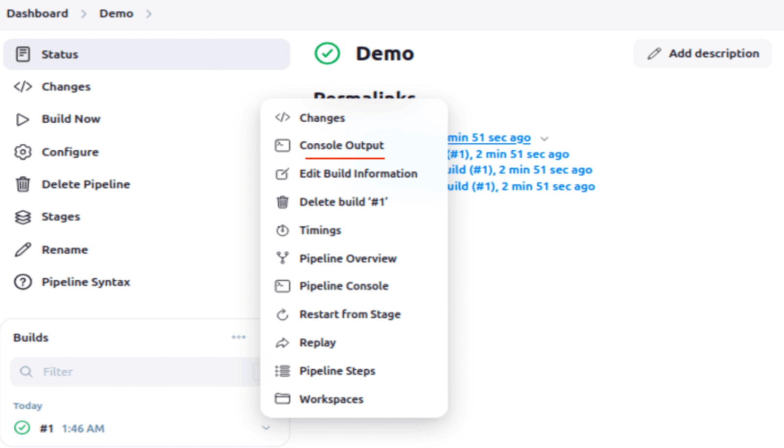 After the build is complete, click on the build number and then on Pipeline Steps or Pipeline Graph.