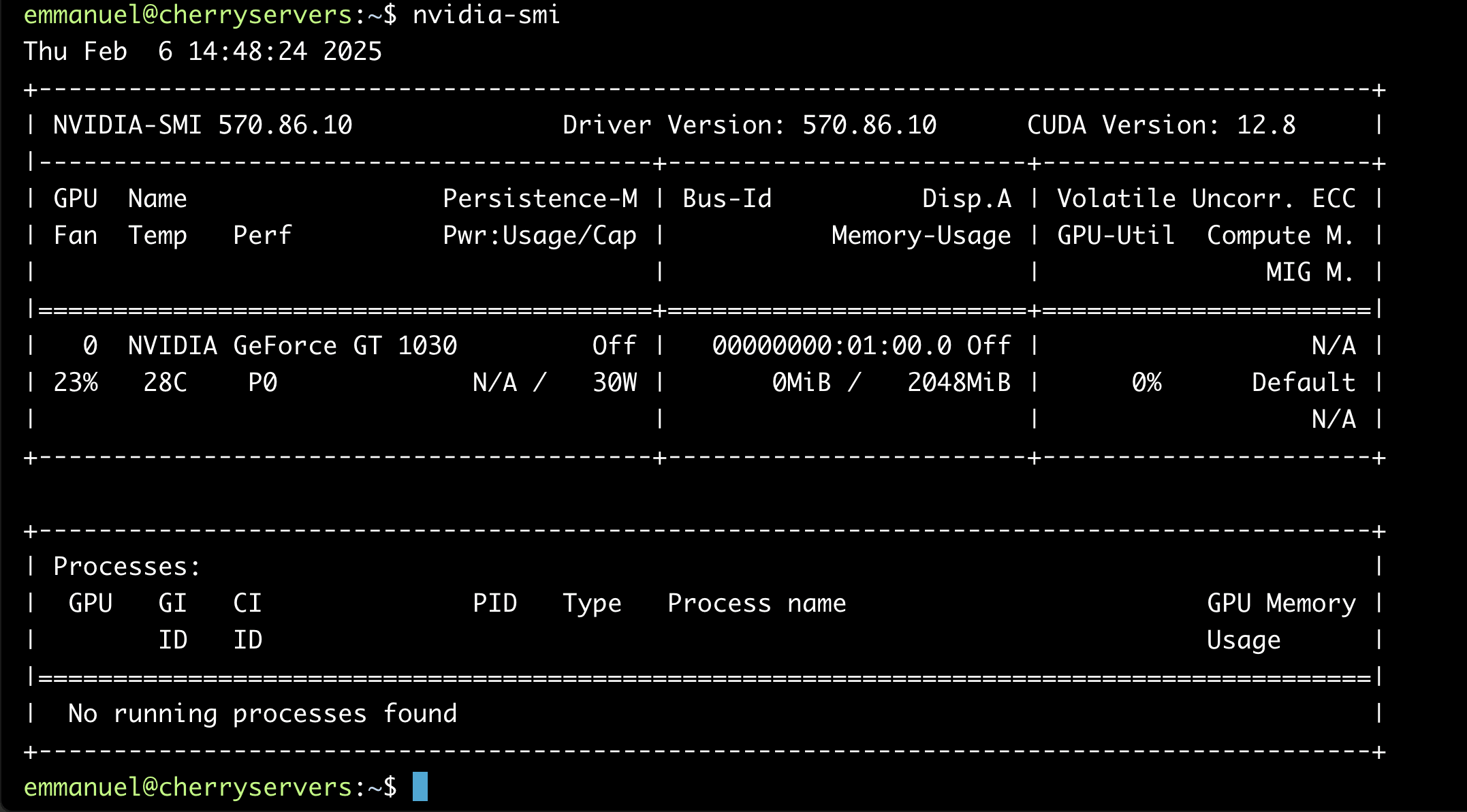 This command displays GPU details like driver version, memory usage, temperature, and more. For example: