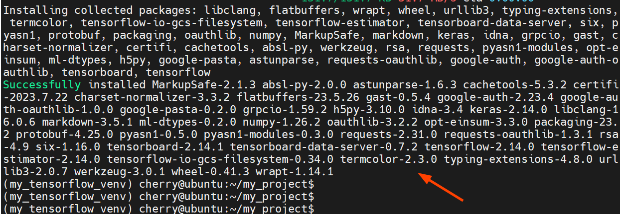 Once complete, you will get a summary of all the installed packages displayed on the terminal. This confirms that the installation of TensorFlow was successful.