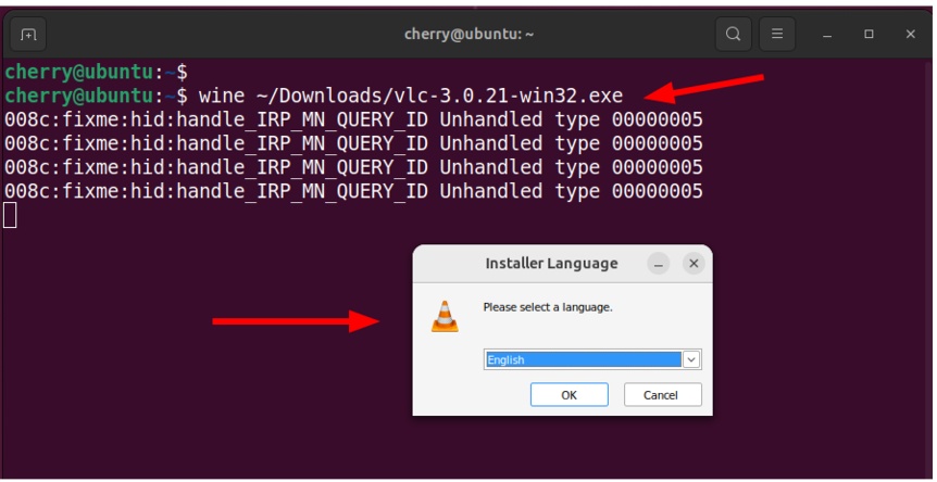 The command launches the VLC installer and you will be prompted to select the installation language.
