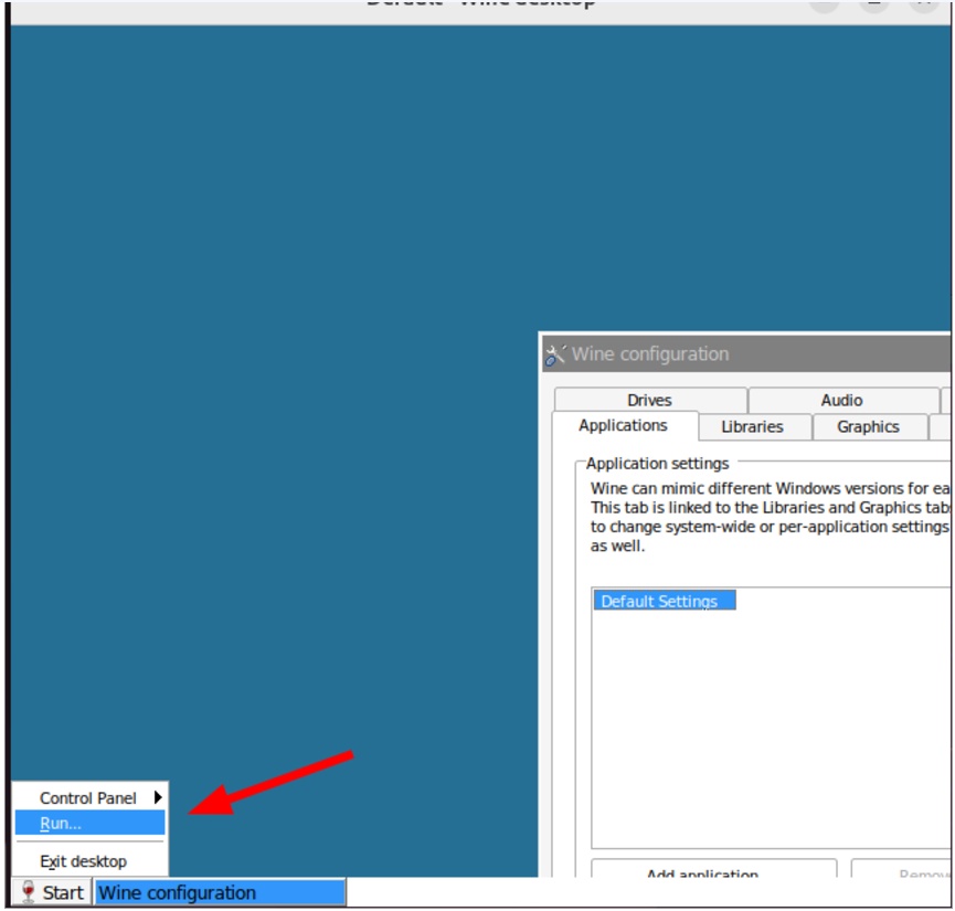 On the Wine virtual desktop, click Start > Run.