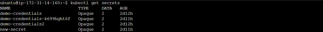 This will create an Opaque Kubernetes secret named demo-credentials using the content of the username.txt and password.txt files as the values for the username key and the password key, respectively, in the demo-credentials secret.