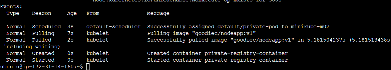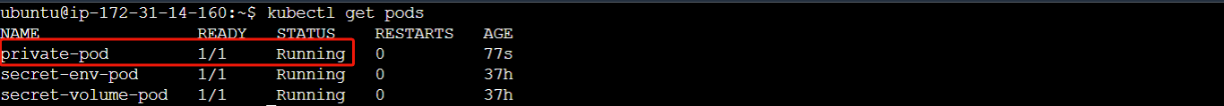 You can confirm if Kubernetes was able to authenticate and pull the image from the registry using the kubectl get pods command. From the image below, you can see that the pod is running indicating that the action was successful.