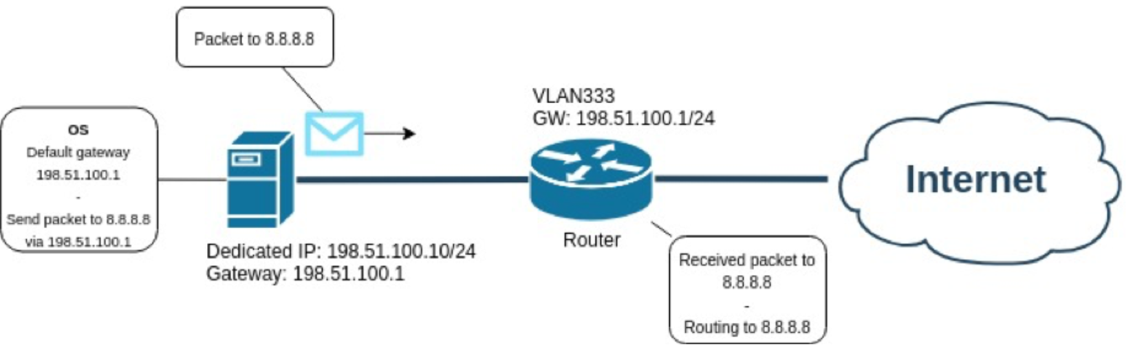 In this example, your server has been assigned with the management IP address 198.51.100.10, which automatically routes to its default gateway address, 198.51.100.1.