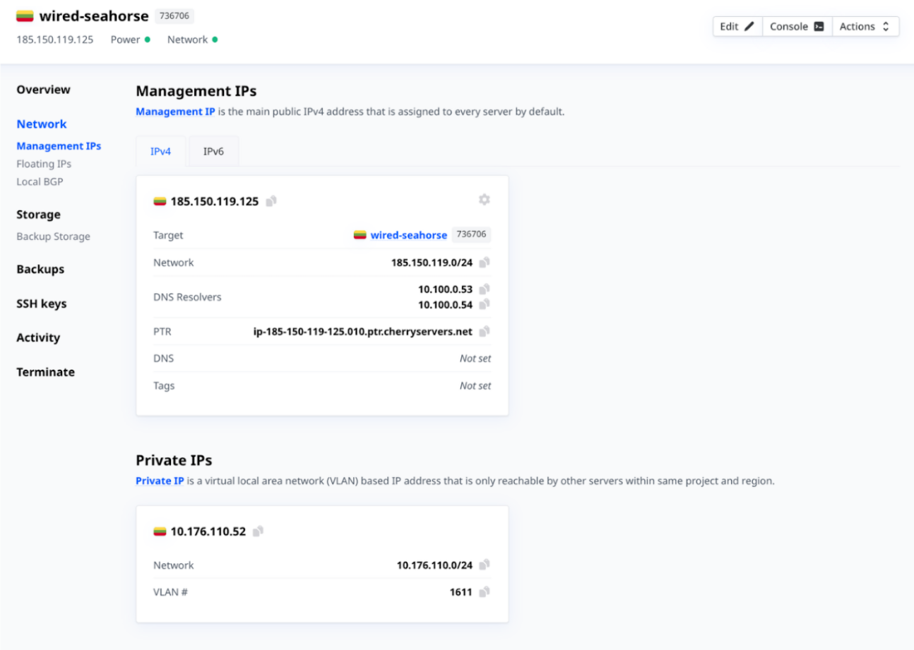 Clients can opt to add additional IP addresses to servers upon deployment, or from the client portal. Below are the IP addressing options offered by Cherry Servers.