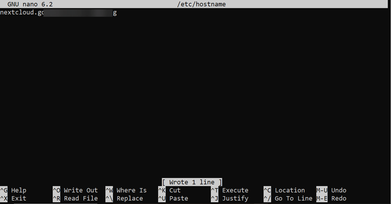 Next, update the server hostname to match the domain pointing to your server. Using the Nano editor, open the hostname file using the following command: