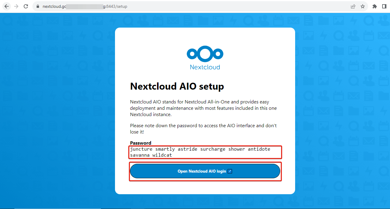 On the setup page, you should see a password displayed. Save the password for later use. Click "Open Nextcloud AIO" to go to the login page.
