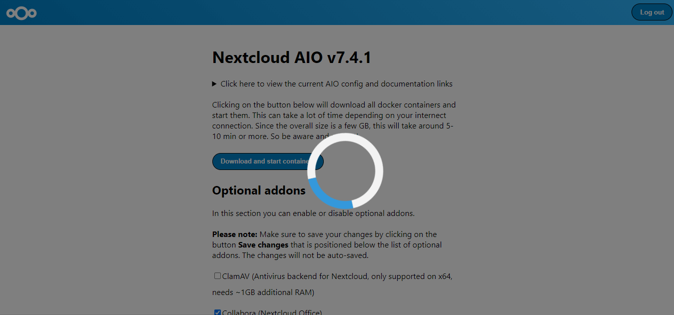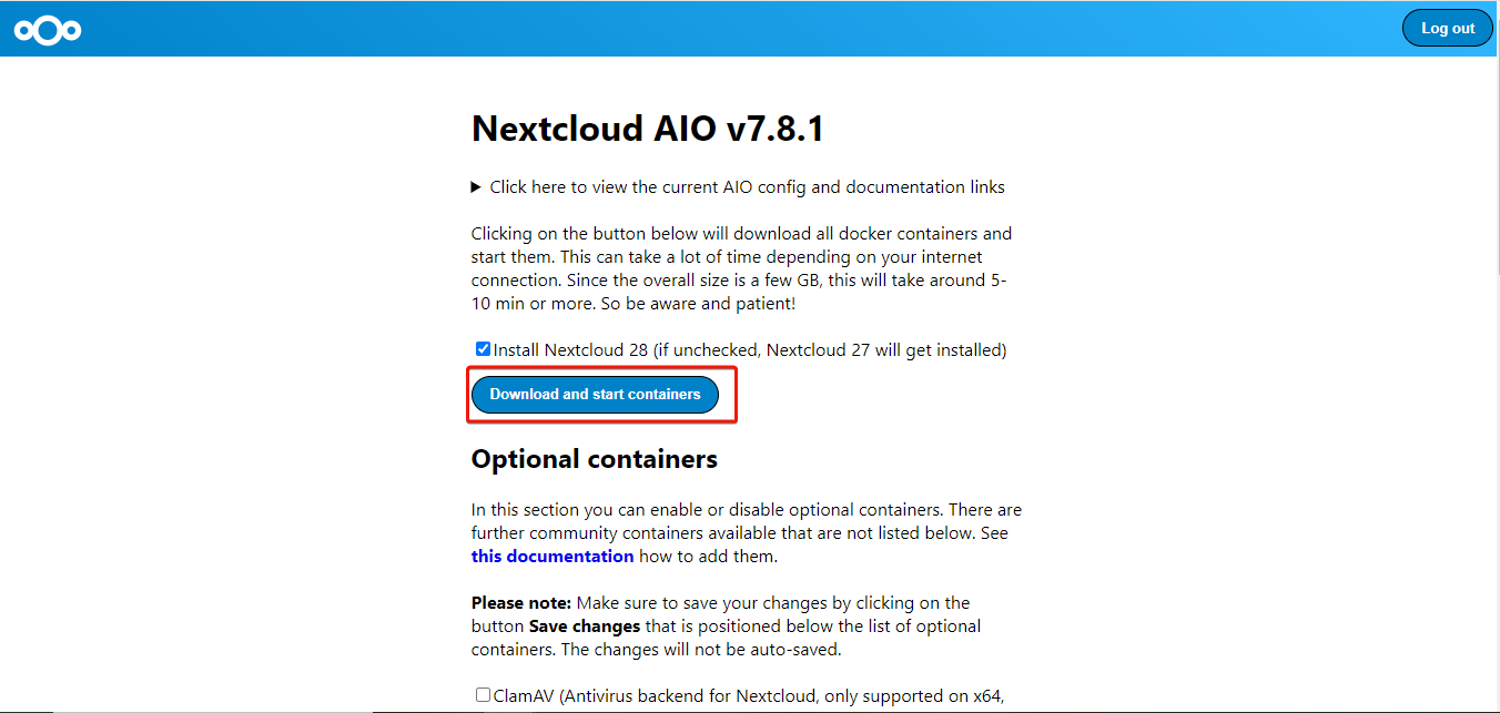 Next, let’s install Nextcloud AIO. For this, select the optional containers you'd like to enable and click the "Download and start containers" button.
