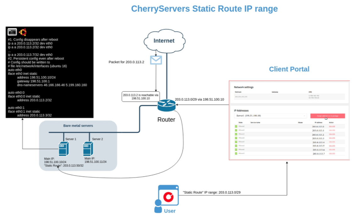 Cherry Servers’ public IP subnet (static route) is an alternate IP subnet using an isolated range of IP addresses to route traffic.