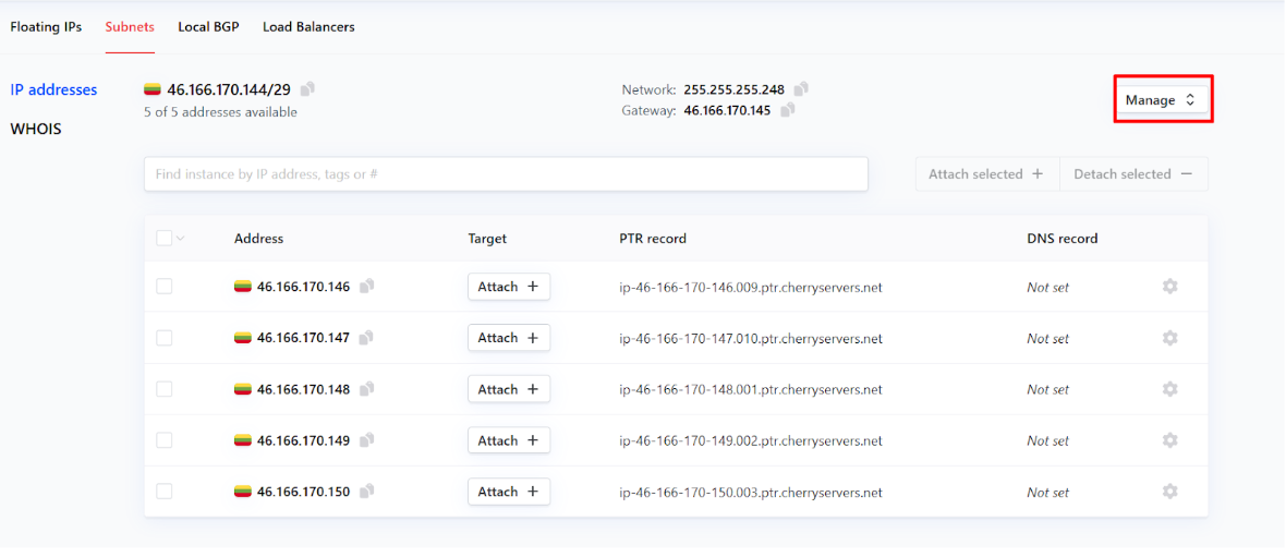 IP subnets come in ranges with a minimum amount of IP addresses included. Available ranged with Cherry Servers currently are: