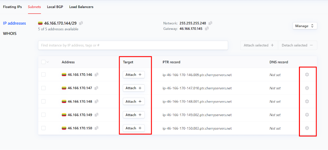 You can attach and alter your available IP addresses, either by clicking “Attach” in the target column on unattached IP addresses, or by clicking the cog next to each address.