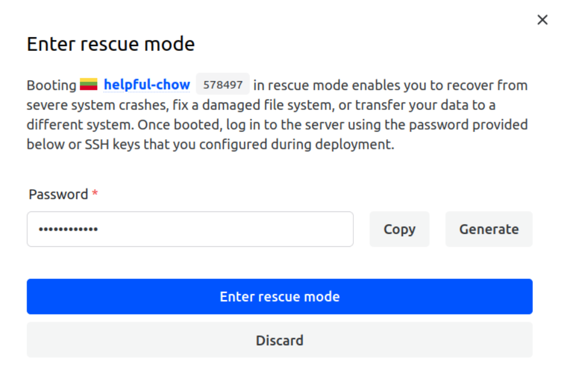 - A pop-up window will appear, asking you to generate a temporary password. This password allows you to access your server while it’s booted into the rescue environment.