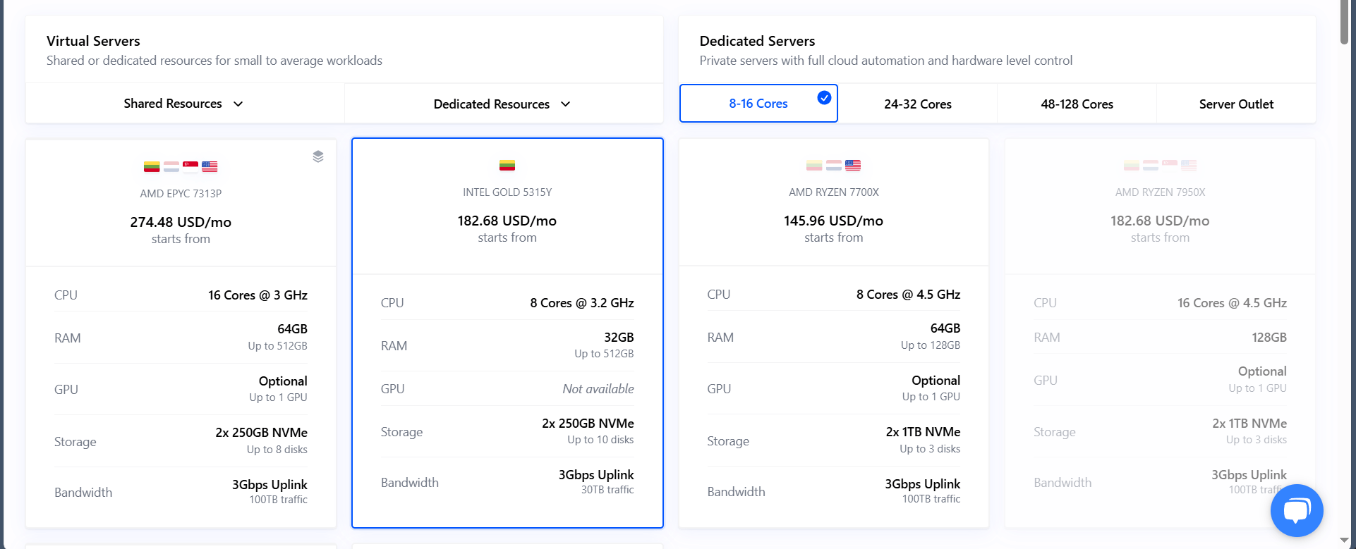 Cherry Servers has many bare metal options from which you can choose. Under the “Dedicated Servers” tab, select the bare metal plan that suits your needs. In this tutorial, we will use the Intel Gold 5315Y server.