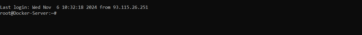 Upon successful login, you will see the following output indicating that you are logged in as a root user with the hostname “Docker-Server” you just created.