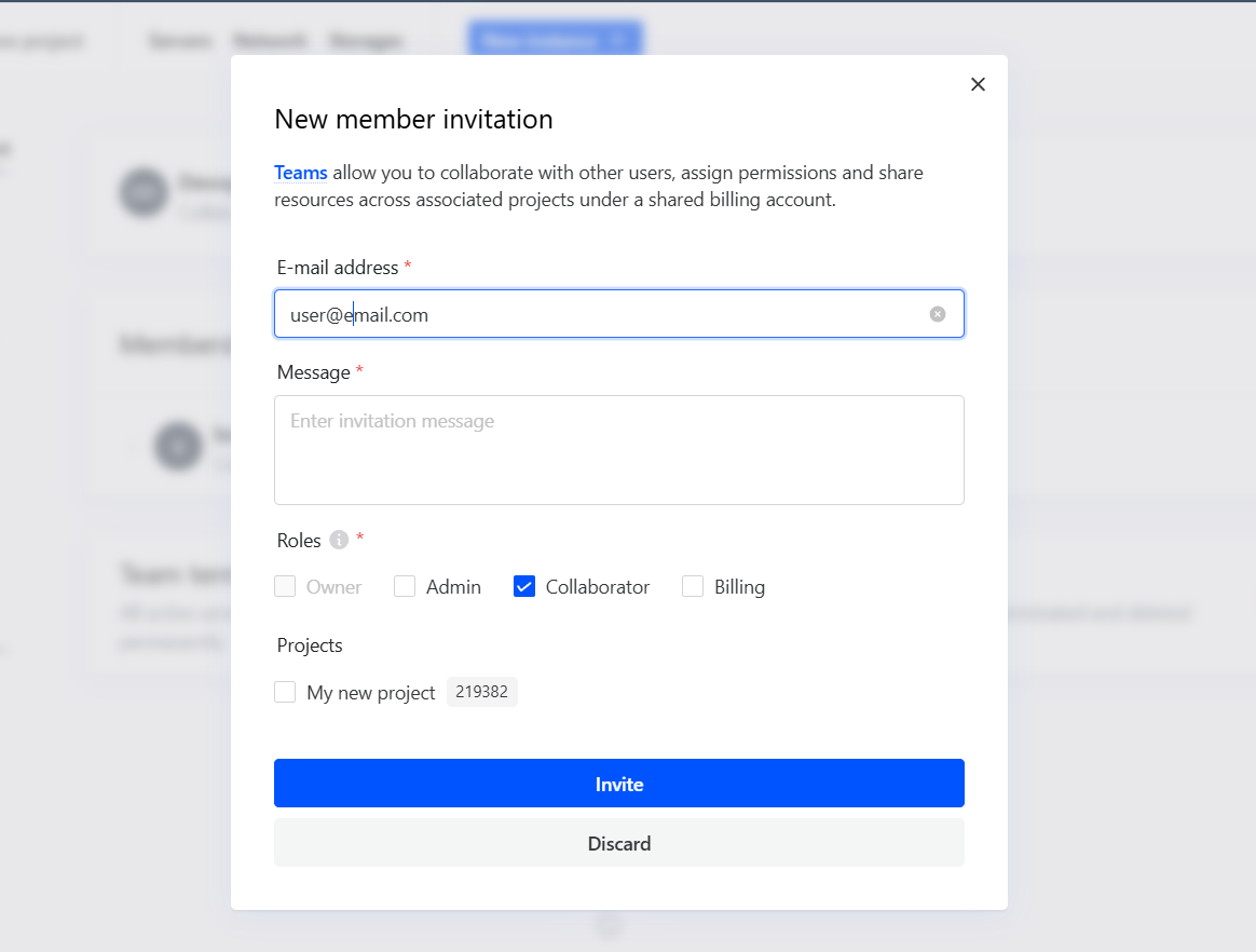 - Collaborator role: This role has minimal rights and access compared to other roles. This role only allows you to order services, view project details, and access the bare metal server.