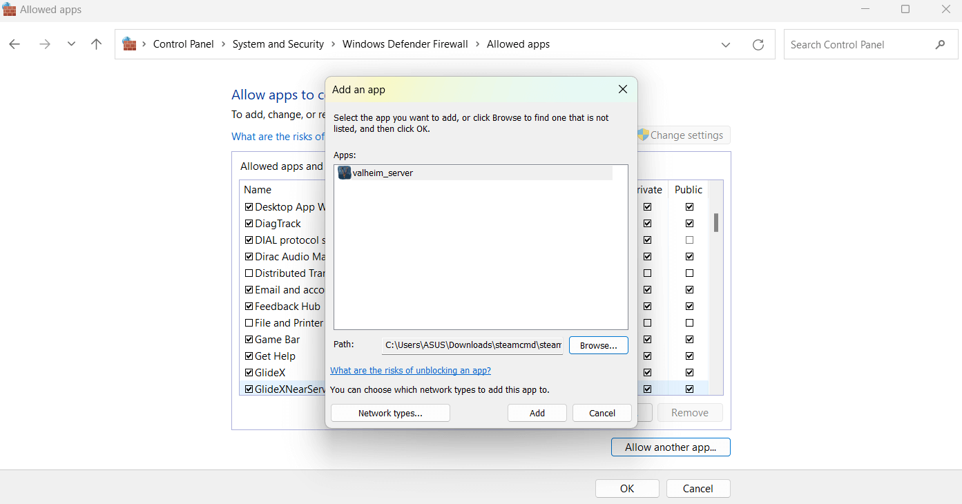 Click “Add” to include the application in the firewall exceptions list.