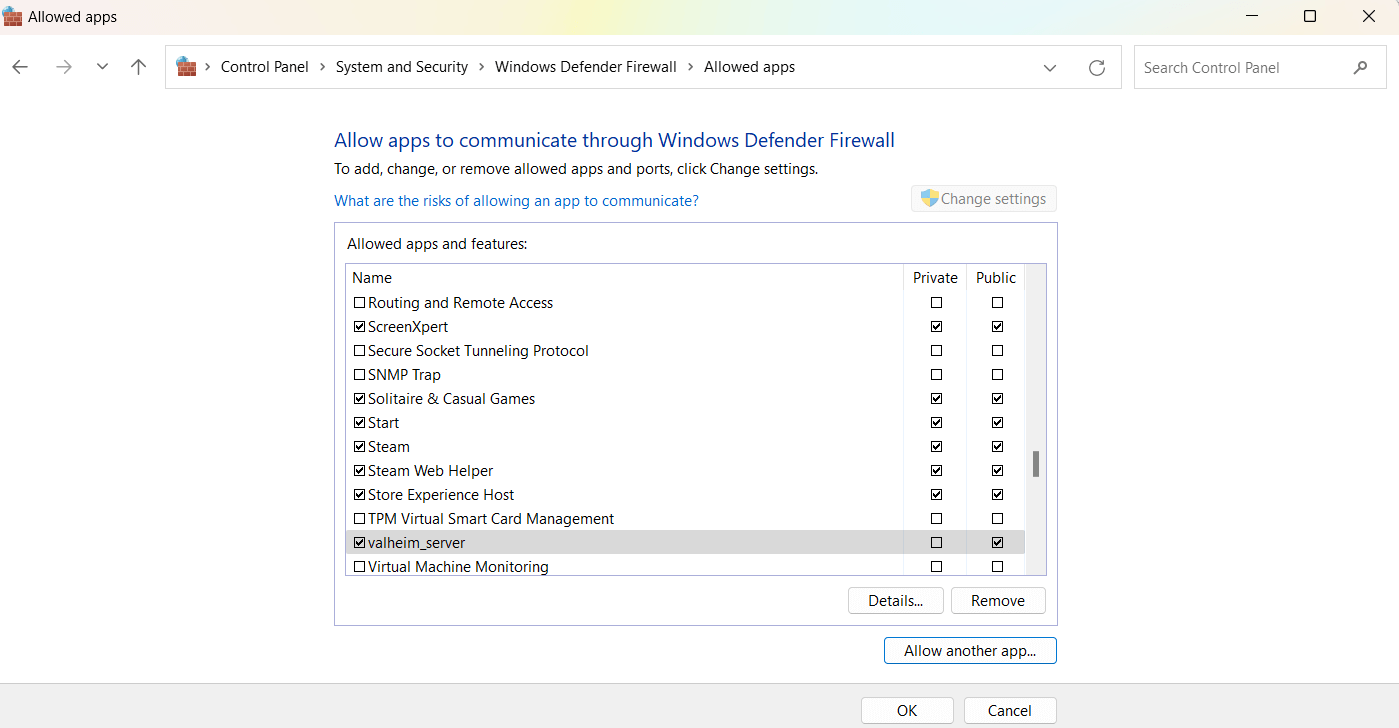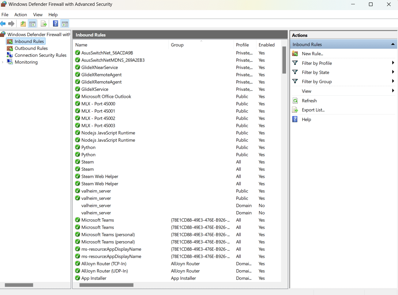 Click "Inbound Rules" You should see multiple entries for valheim_server.exe. This confirms that the firewall is allowing connections for the Valheim server.