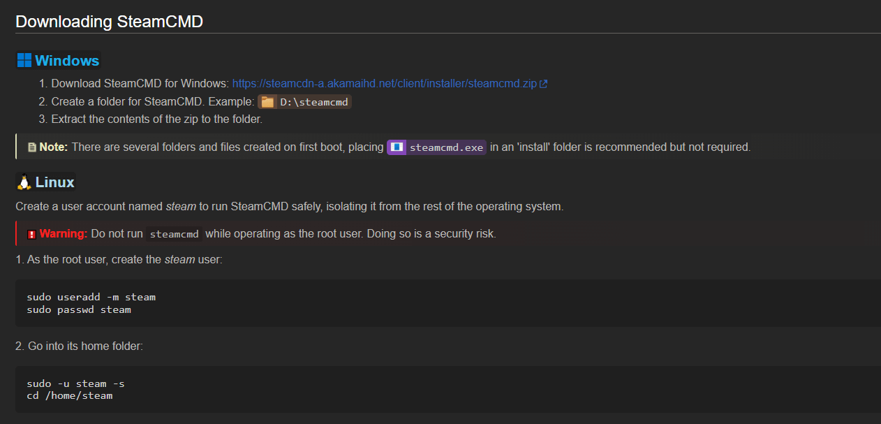 Scroll down to the “Downloading SteamCMD” section and check the Windows section.