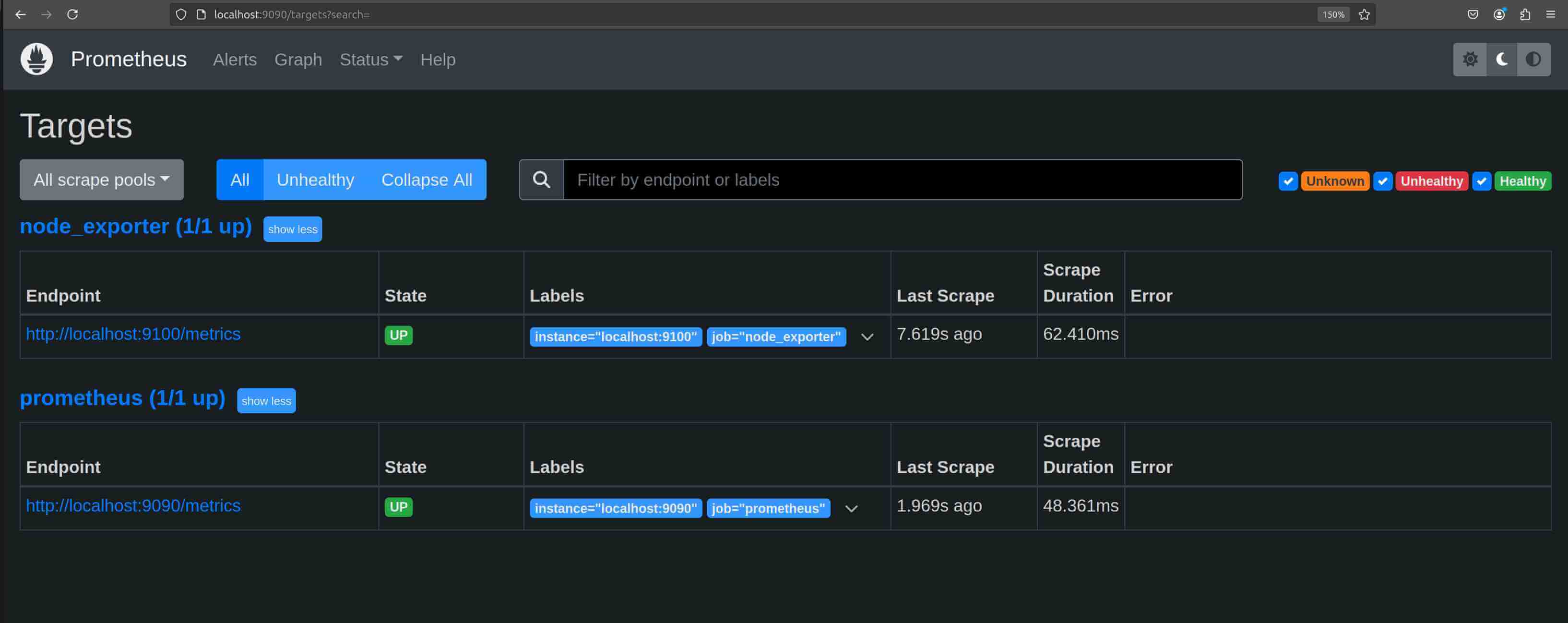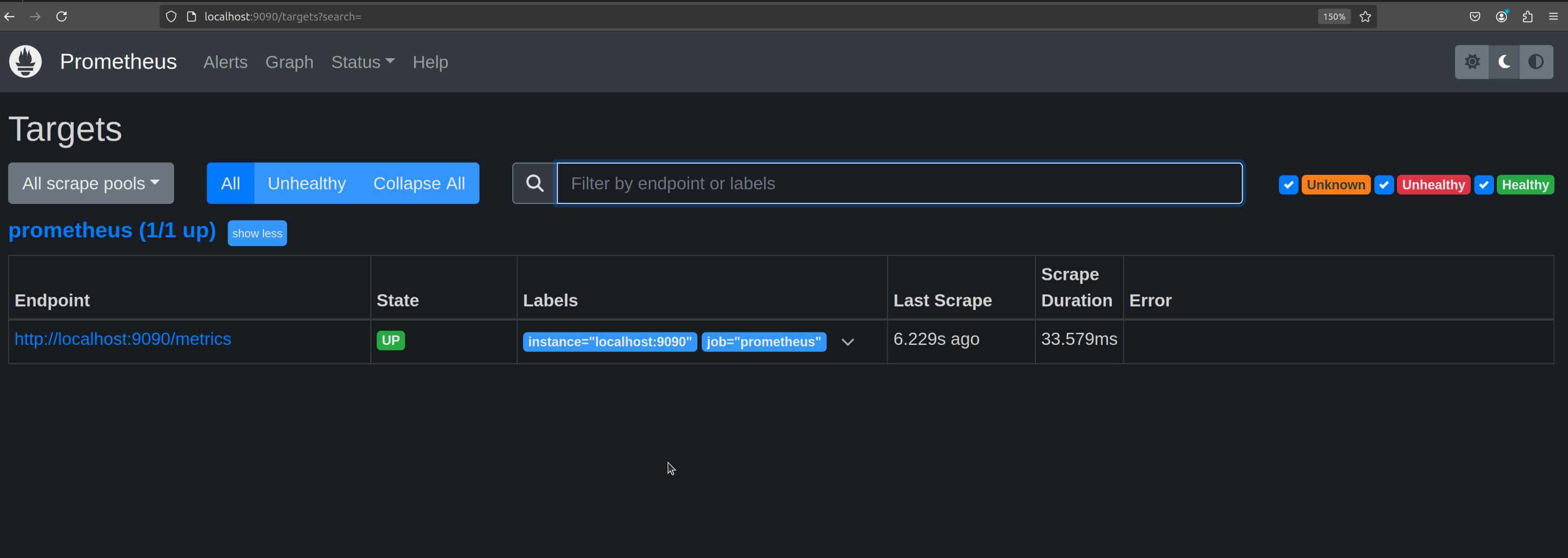 To confirm that Prometheus is collecting data from configured targets, go to Status > Targets: