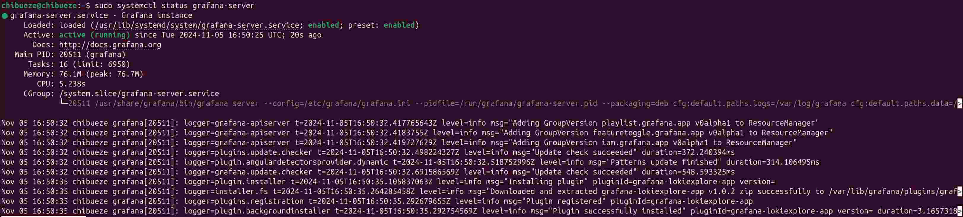 sudo systemctl status grafana-serverThis command displays the status of the Grafana service. If Grafana is running successfully, you’ll see a similar output to this: