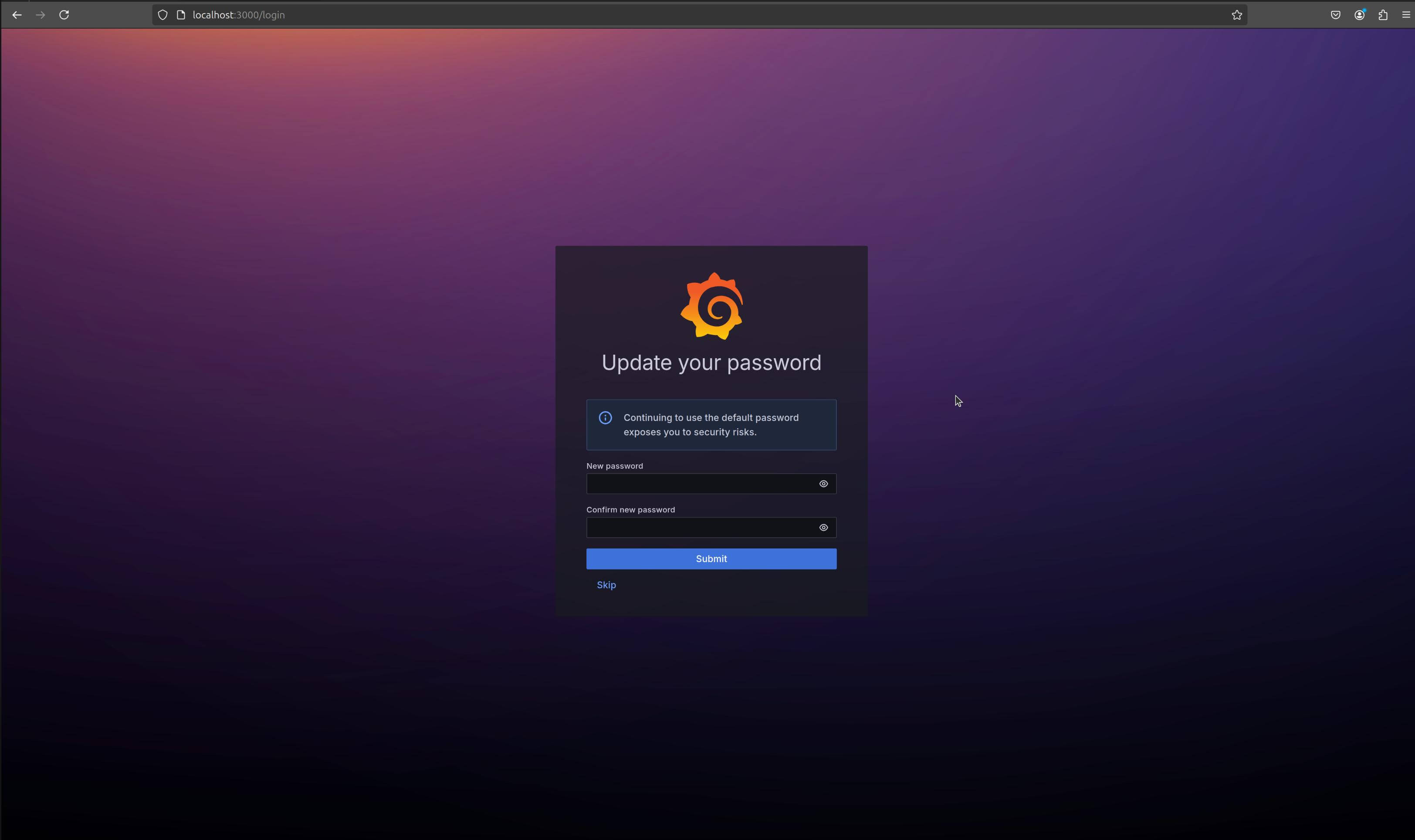Visit http://localhost:3000 on a web browser. Once loaded, you should see the Grafana login screen. Login using the default username and password—