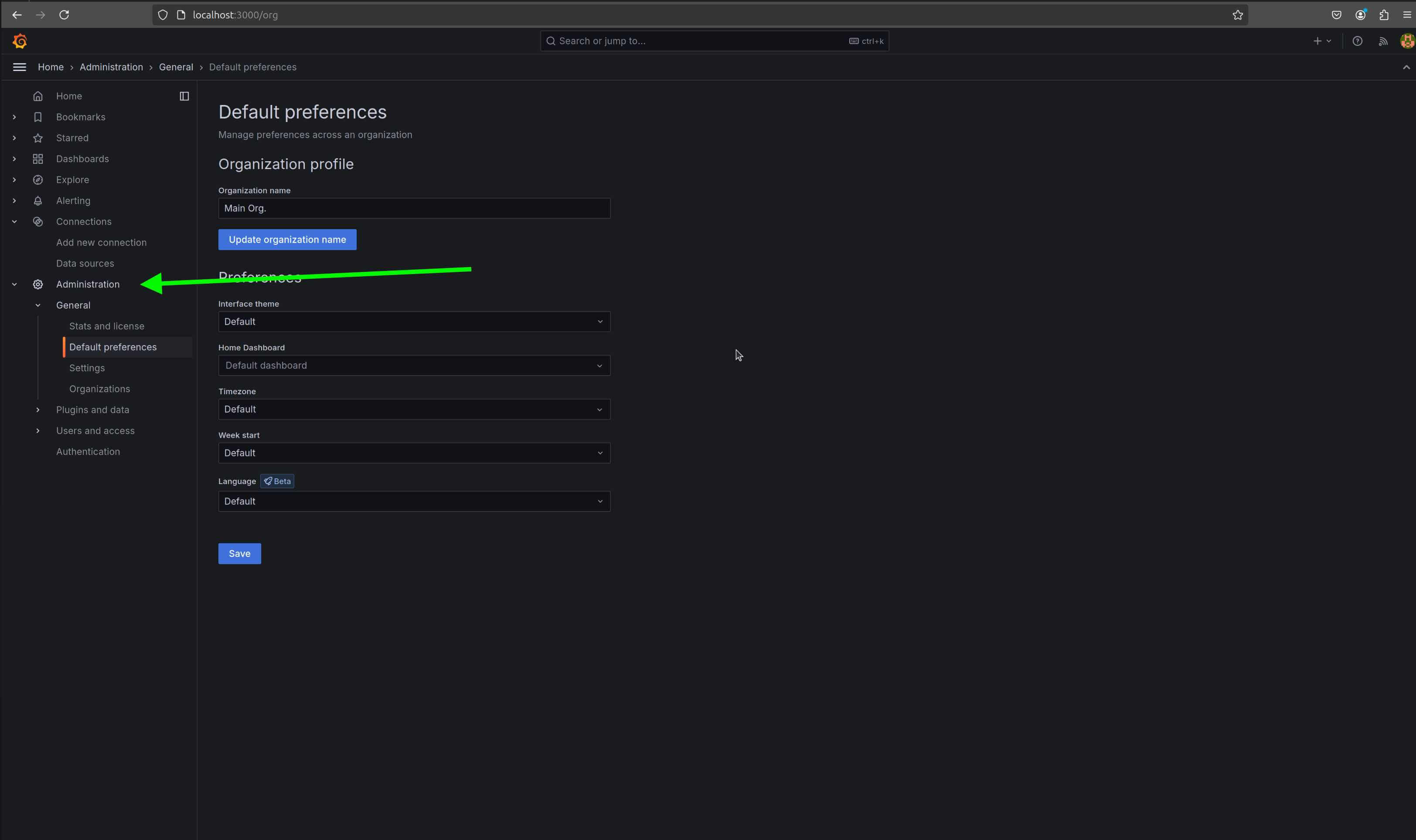 Firstly, log in to Grafana if you haven’t already. Then, if desired, you can set some basic preferences by clicking on the Administration sidebar option: