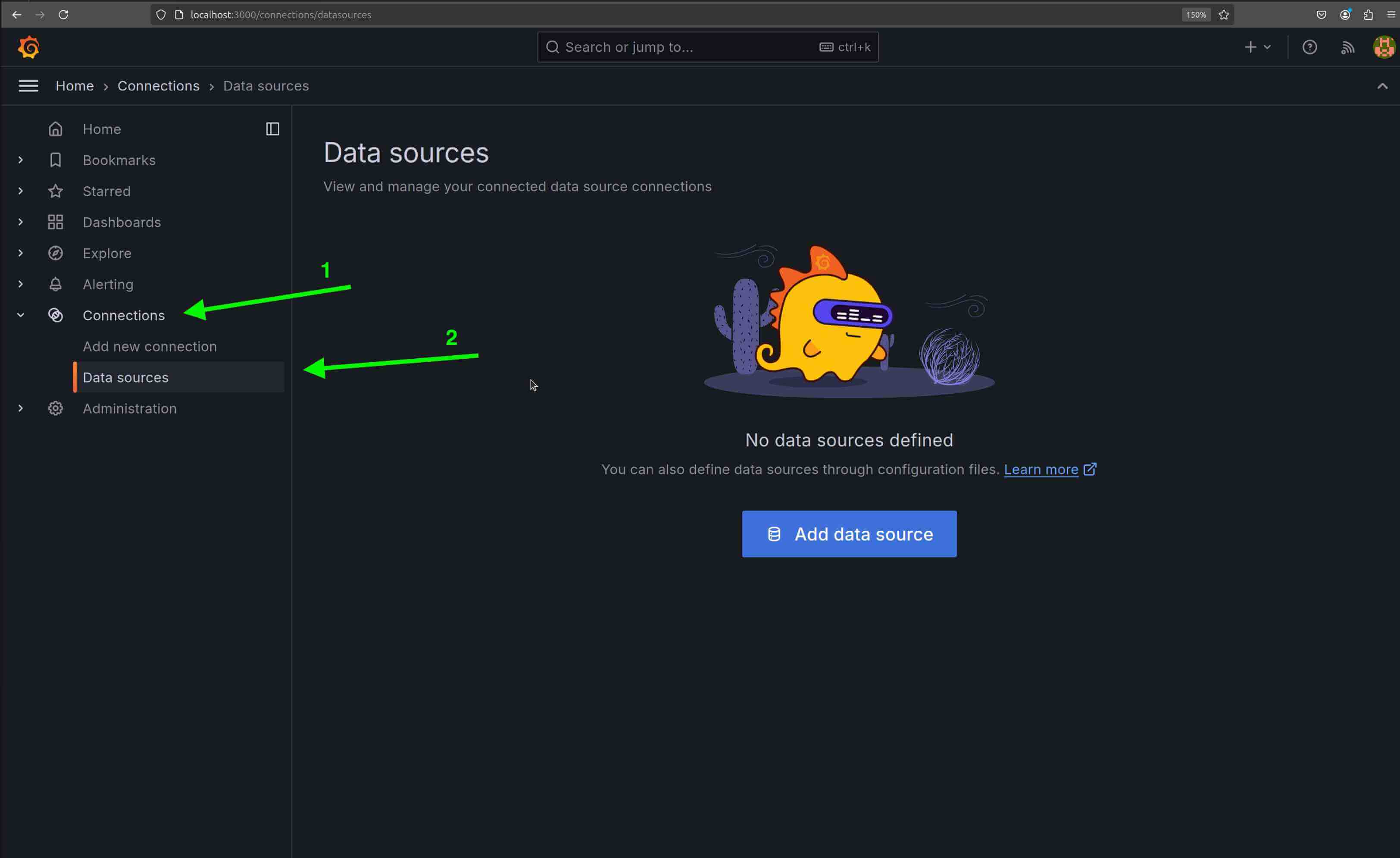 In the left sidebar, click to expand Connections then select Data sources. It will open the data sources management page, where you can add, view, and configure various data sources.
