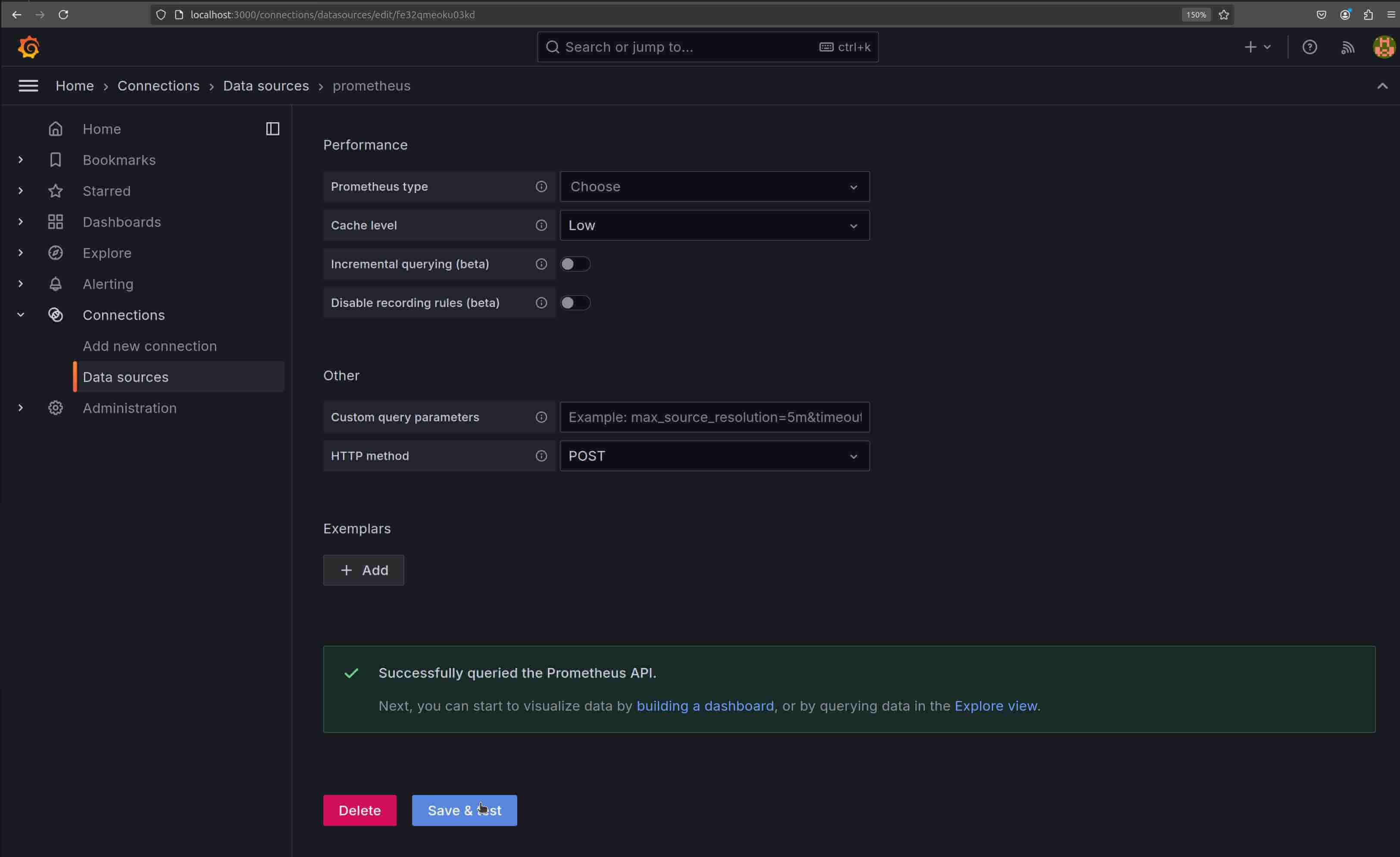Click on the Save & test button. Grafana will attempt to connect to Prometheus and display a success message if the connection is successful.