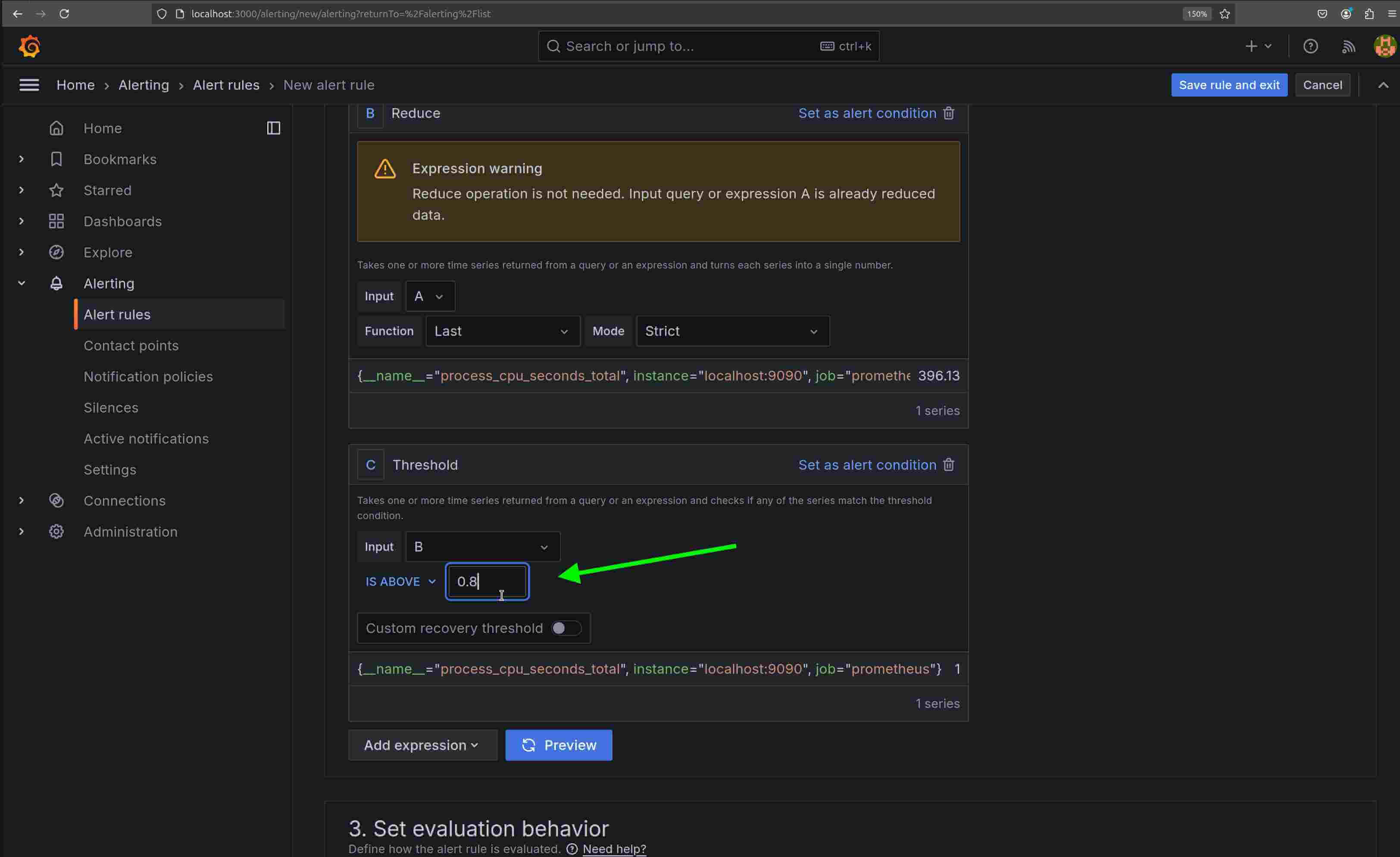 In the Threshold section, you can specify when the alert should be triggered. For instance, you can configure the alert to trigger if the metric value is above or below a certain threshold: