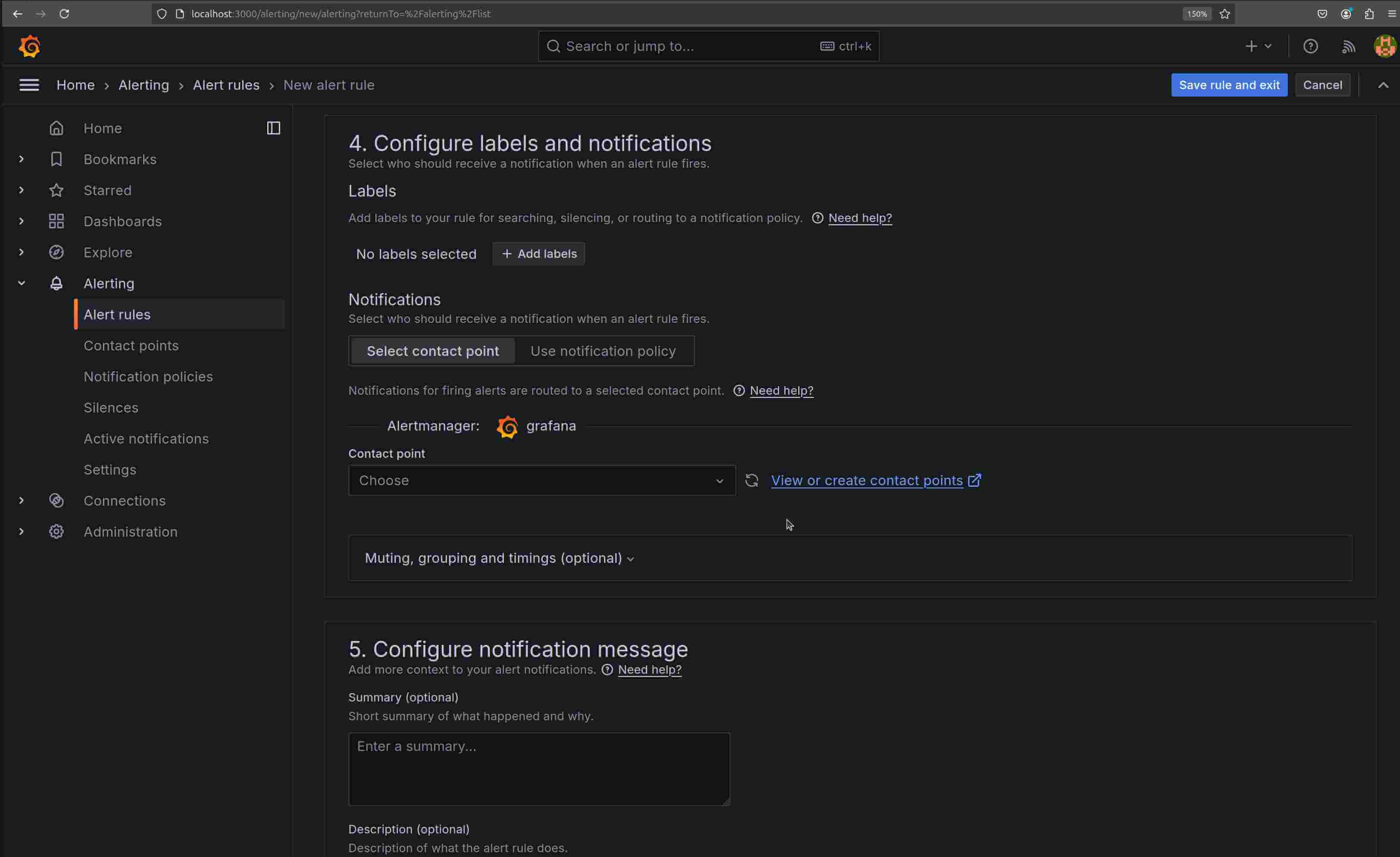 For notifications, select who should be alerted when this rule triggers. Click Select contact point and choose an existing contact point or create a new one by following the View or create contact points link. Contact points allow you to specify where notifications are sent, such as email or Slack.