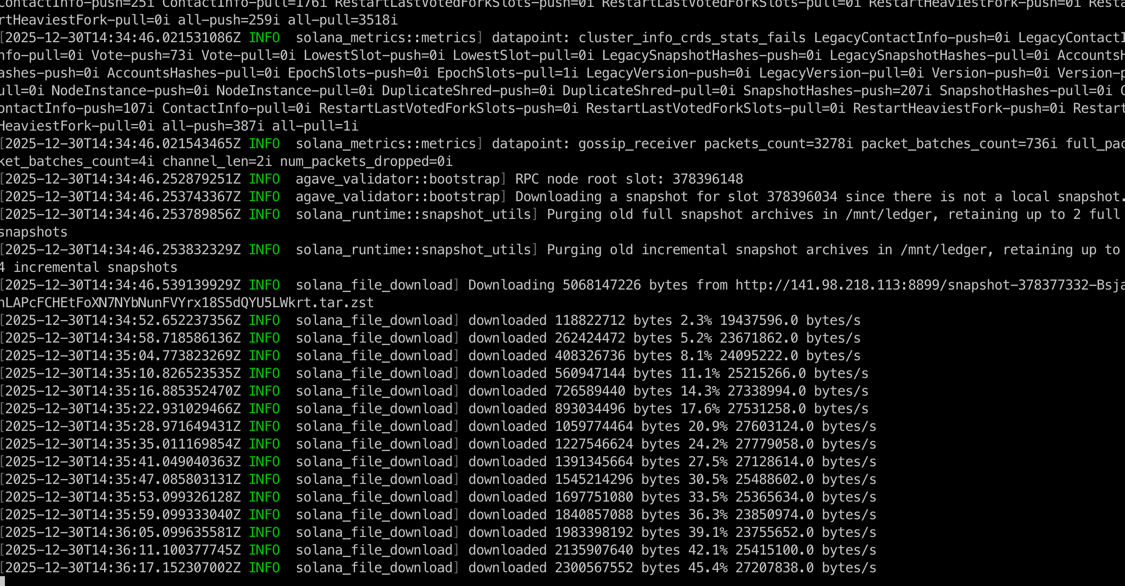 Your validator will now begin synchronizing with the Solana network. For full archive nodes, this process can take anywhere from several days to weeks, depending on your hardware performance. Partial archive nodes sync significantly faster since they don't need to download the complete history.
