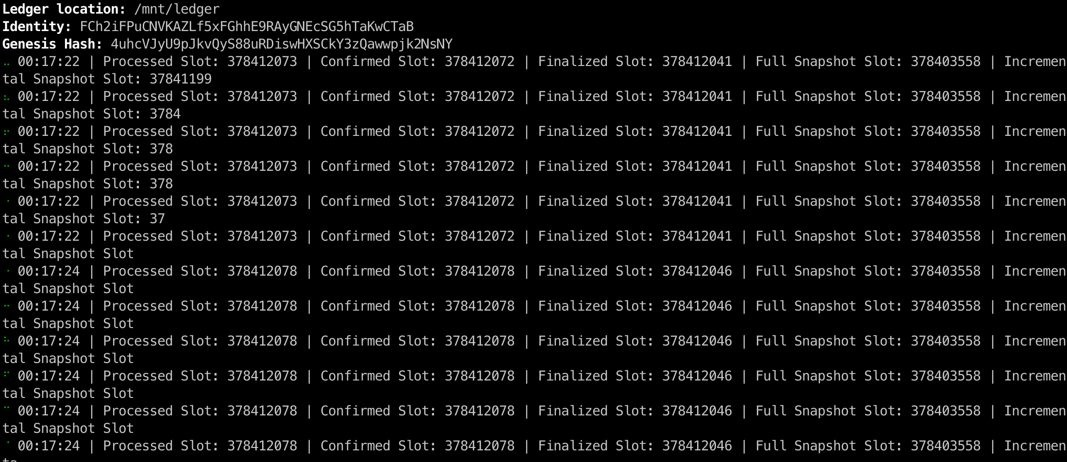 This command displays your current slot number compared to the network's current slot. The difference between these values indicates how far behind you are in the synchronization process. As your validator catches up, this gap will gradually decrease until your node is fully synchronized with the network.