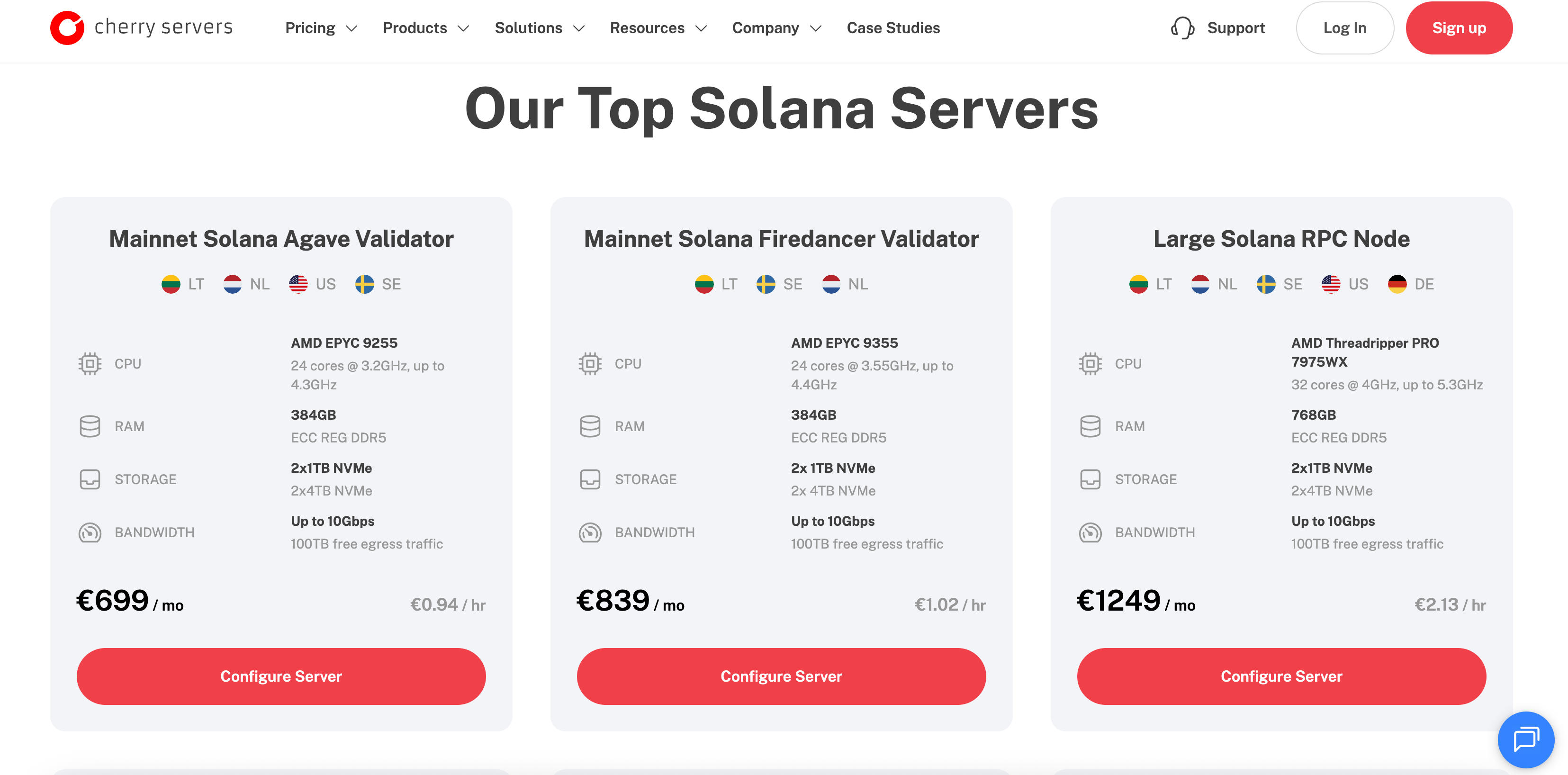 Cherry Servers' Solana-specific offerings typically include several configurations optimized for different use cases. For a full archive node, you'll want their highest-tier configuration with maximum storage. For partial archive nodes, mid-tier configurations with 10-50TB storage may suffice depending on your retention needs.