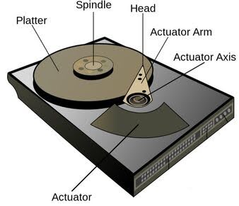 Inside a hard disk drive are shiny circular disk platters with magnetic coatings attached to a spindle. The spindle is connected to a motor that spins between 5400 and 7200 RPM (higher in enterprise environments such as data centers). A read/write head, attached to an actuator arm, moves back and forth on the surface of the disk platters to write and access data.