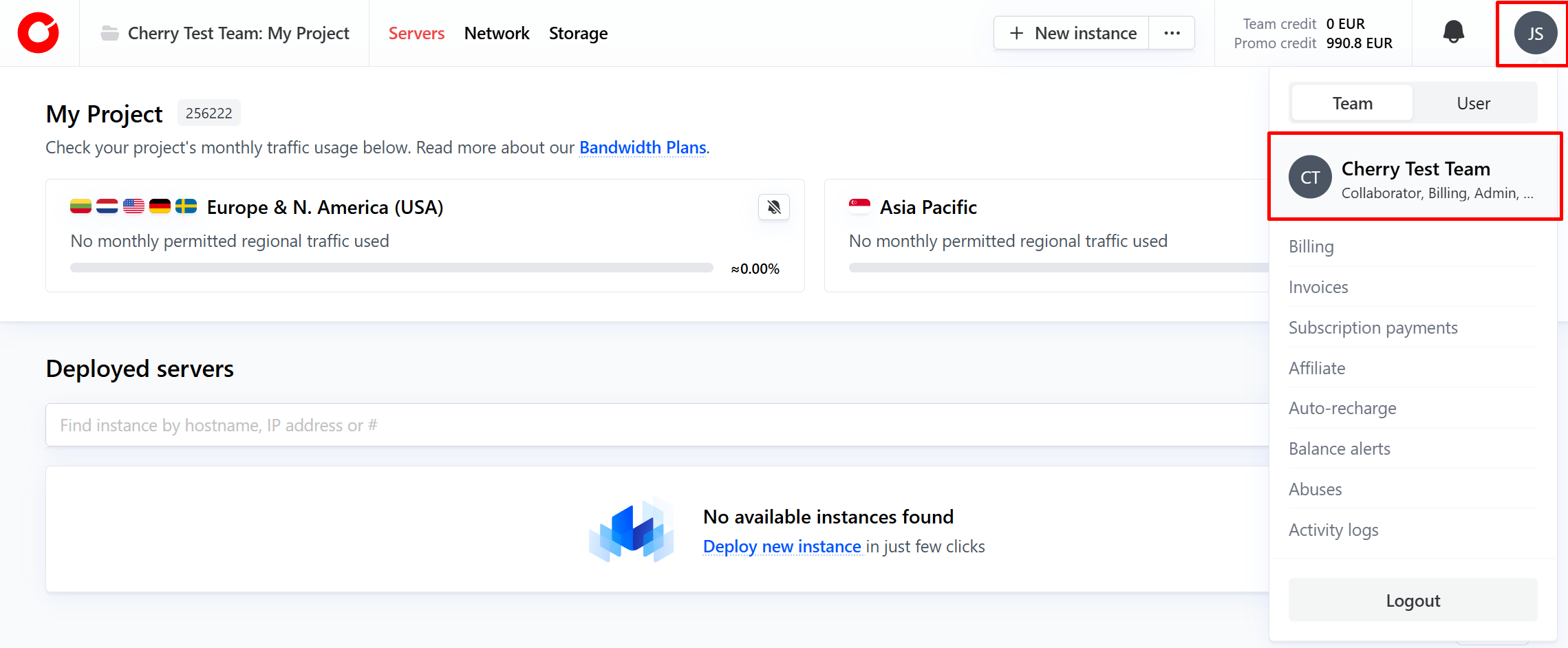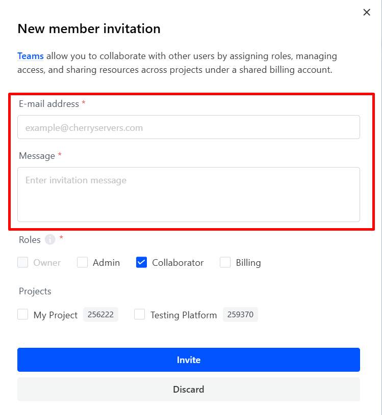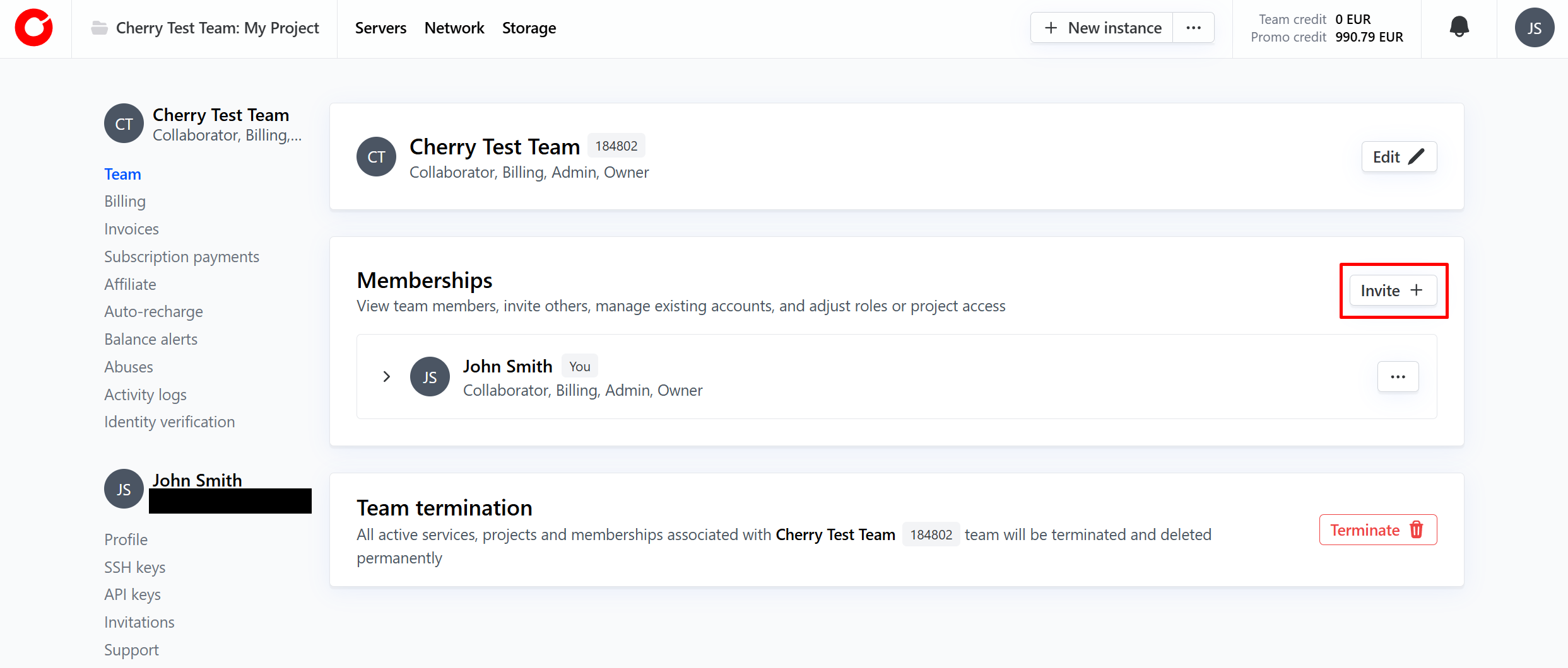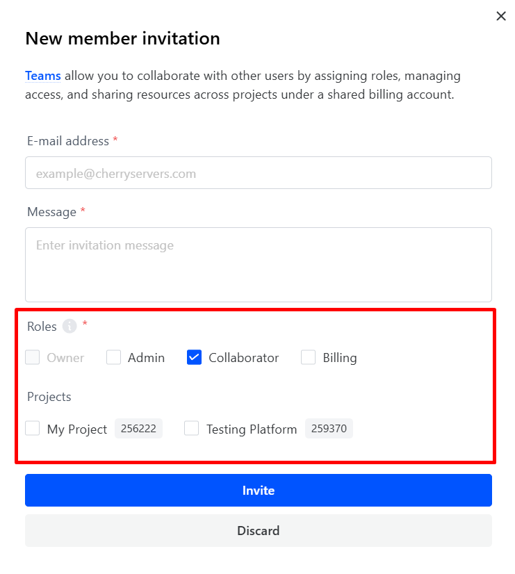 Through the Cherry Servers client portal, clients can manage their teams and team members to invite new people to the team, and assign permissions. Team roles and their respective permissions can be assigned across any projects linked to that team.